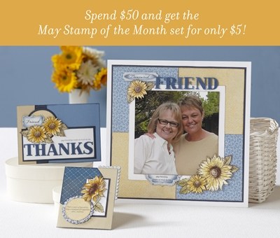 This month we are featuring the Friendship Bouquet stamp set - a set of 8 gorgeous stamps! I love this stamp set because I LOVE Sunflowers...they just make me smile.